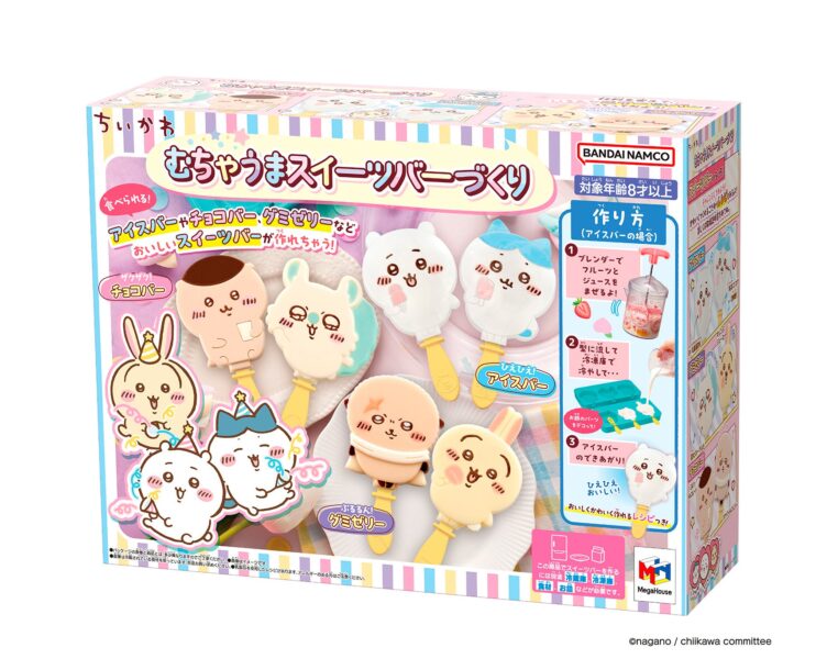 この製品は、付属のブレンダーや型トレイを使用して「ちいかわ」のキャラクターをモチーフにした『アイスバー』『チョコバー』『グミゼリー』の3種類のスイーツを作ることができるクッキングトイで、カットしたフルーツやジュースをブレンダーで混ぜてアイス液やゼリー液を作り、スティックを配置した型トレイに流し込み、冷蔵庫で冷やして固めることができるグッズです。