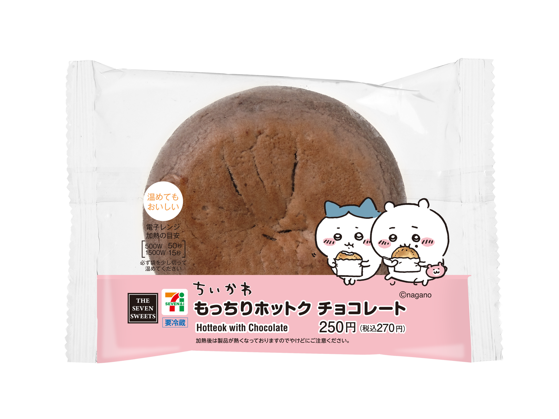 ちいかわとリボンをなくしてしまったハチワレが食べていたおやきをイメージした商品。ビターな味わいのチョコレートが入ったもちもち食感のホットクです。