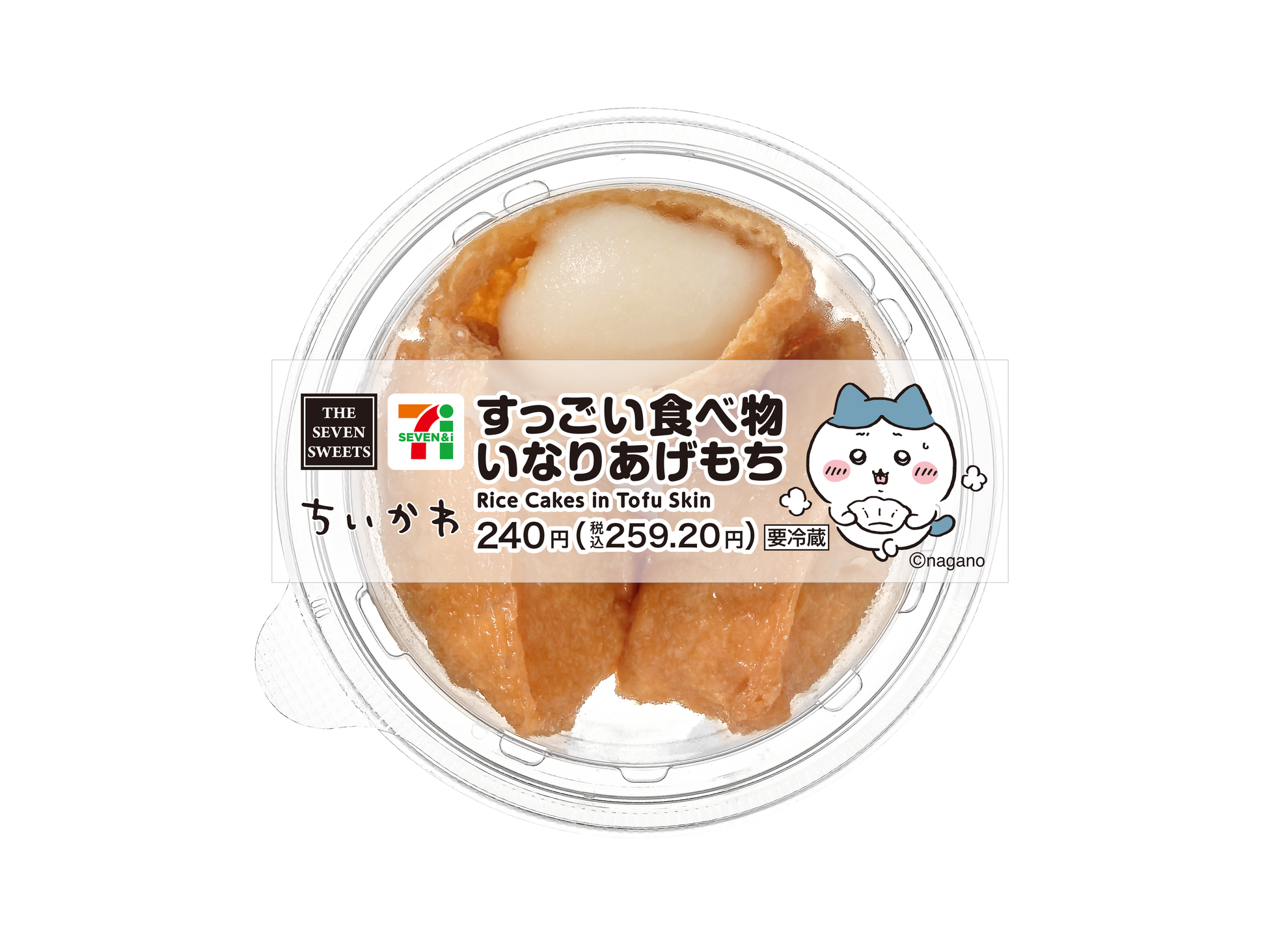 ハチワレがちいかわに「共有」したかった、すっごい食べ物の「いなりあげもち」をイメージした商品。コシのあるおもちを甘辛く煮た油揚げで包みました。