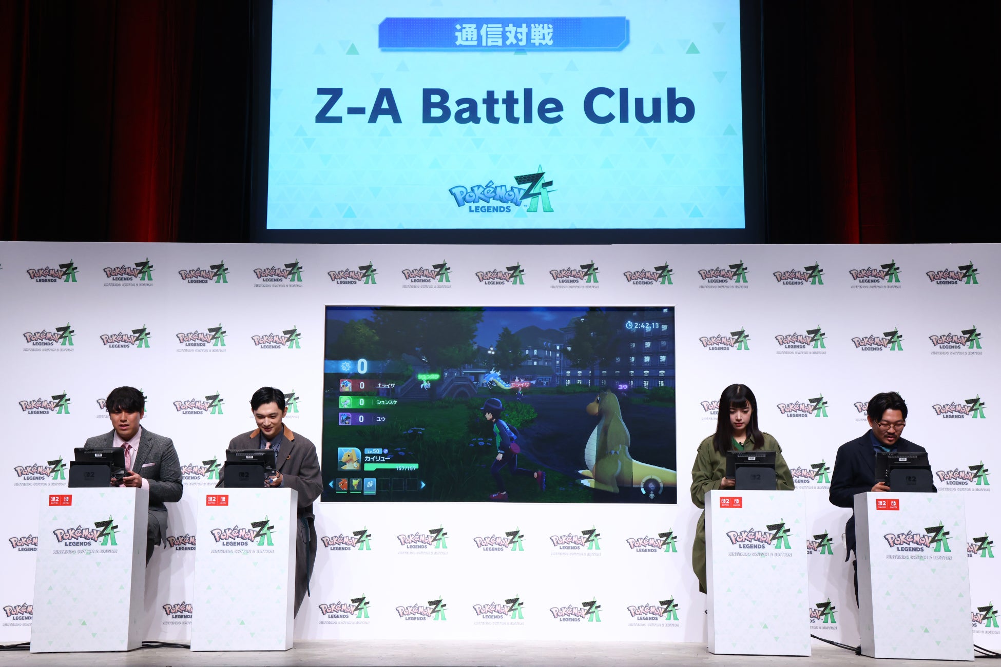 続いて行われた通信対戦の前には、ゲストの皆さんから「ぜってー勝ちます!」と力強い意気込みが飛び出し、会場の期待も最高潮に。フリーアナウンサーの篠原光さんの実況のもと、白熱の「Z-A Battle Club」がスタートしました。モニター上には対戦中の画面が投影され、ゲストの楽しむ姿が印象的でした。