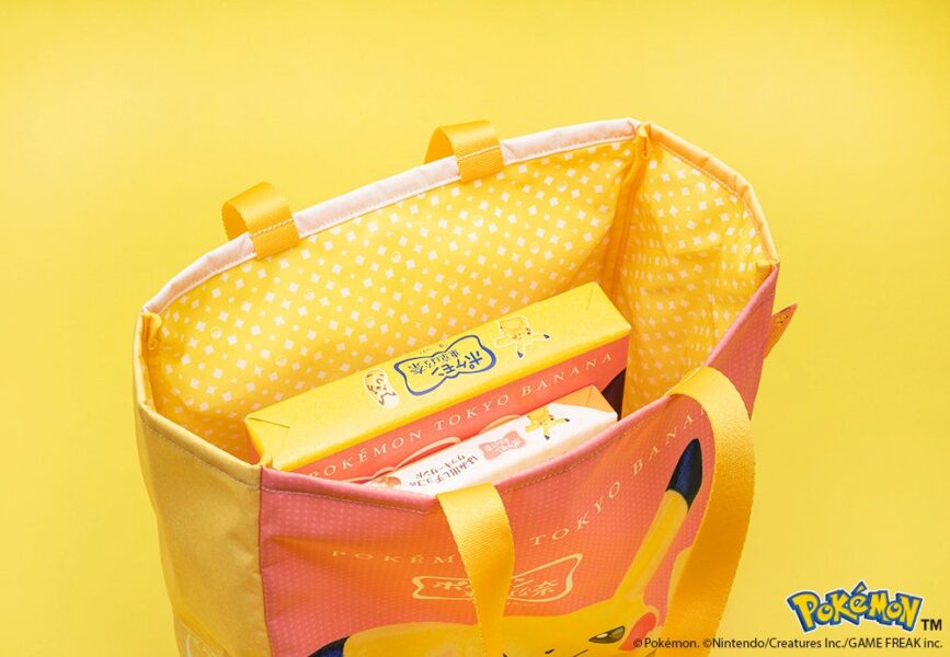 今回の「ポケモン東京ばな奈」5周年企画では、お菓子とバッグがセットになった「ピカチュウバッグセット」が登場し、5周年を記念して第1弾として発売した「ピカチュウ東京ばな奈」のパッケージデザインがトートバッグとして仕立てられています。トートバッグは2種類のお菓子と組み合わせたセット商品となっており、5周年を祝う特別なアイテムとして販売されます。