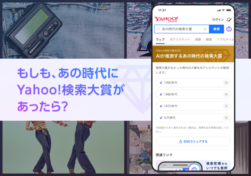 「Yahoo!検索」では、チャット形式で情報を深掘りできる「AIアシスタント」機能を提供しています。今回の特別企画「AIが推測するあの時代の検索大賞」では、「AIアシスタント」が江戸時代から1990年代までの”架空の検索トレンド”を推測し、各時代の大賞を発表します。思わず誰かに話したくなる、AIならではの楽しさを体験できる特別コンテンツです。