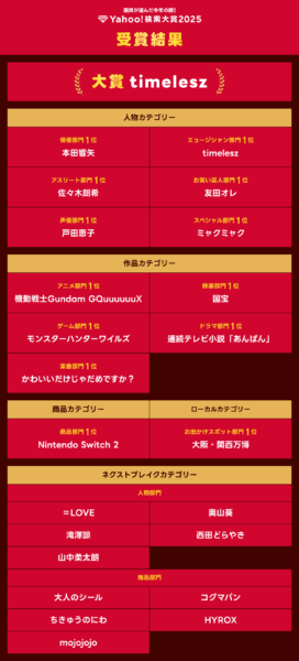 「この度、timeleszがYahoo!検索大賞2025およびミュージシャン部門の1位に選出いただきました。2月に8人体制となった年に選出されたこと、とても光栄に思います。来年以降も皆さまにたくさん検索していただけるように、日々の活動を頑張っていきたいと思います」