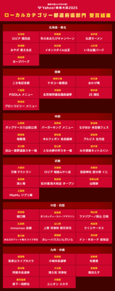 「Yahoo!検索」で「検索大賞 都道府県」と検索すると、2025年に各都道府県で最も検索数が急上昇したワードが検索結果上部に表示されます。